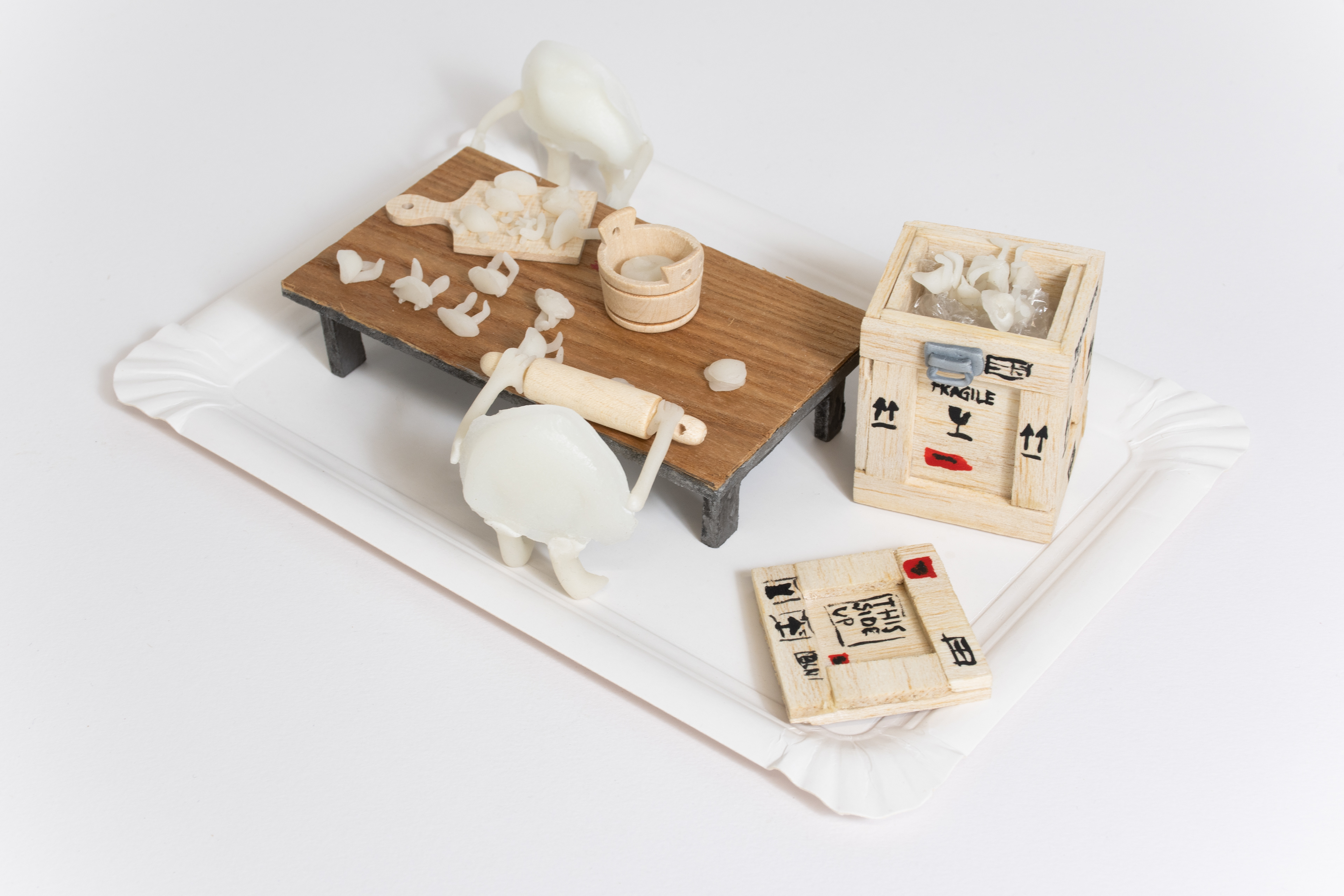 "Living Menu" consists of resin food castings with arms and legs. The work tells stories of how cultural history is embedded in certain dishes and how certain ingredients changed the course of human history.