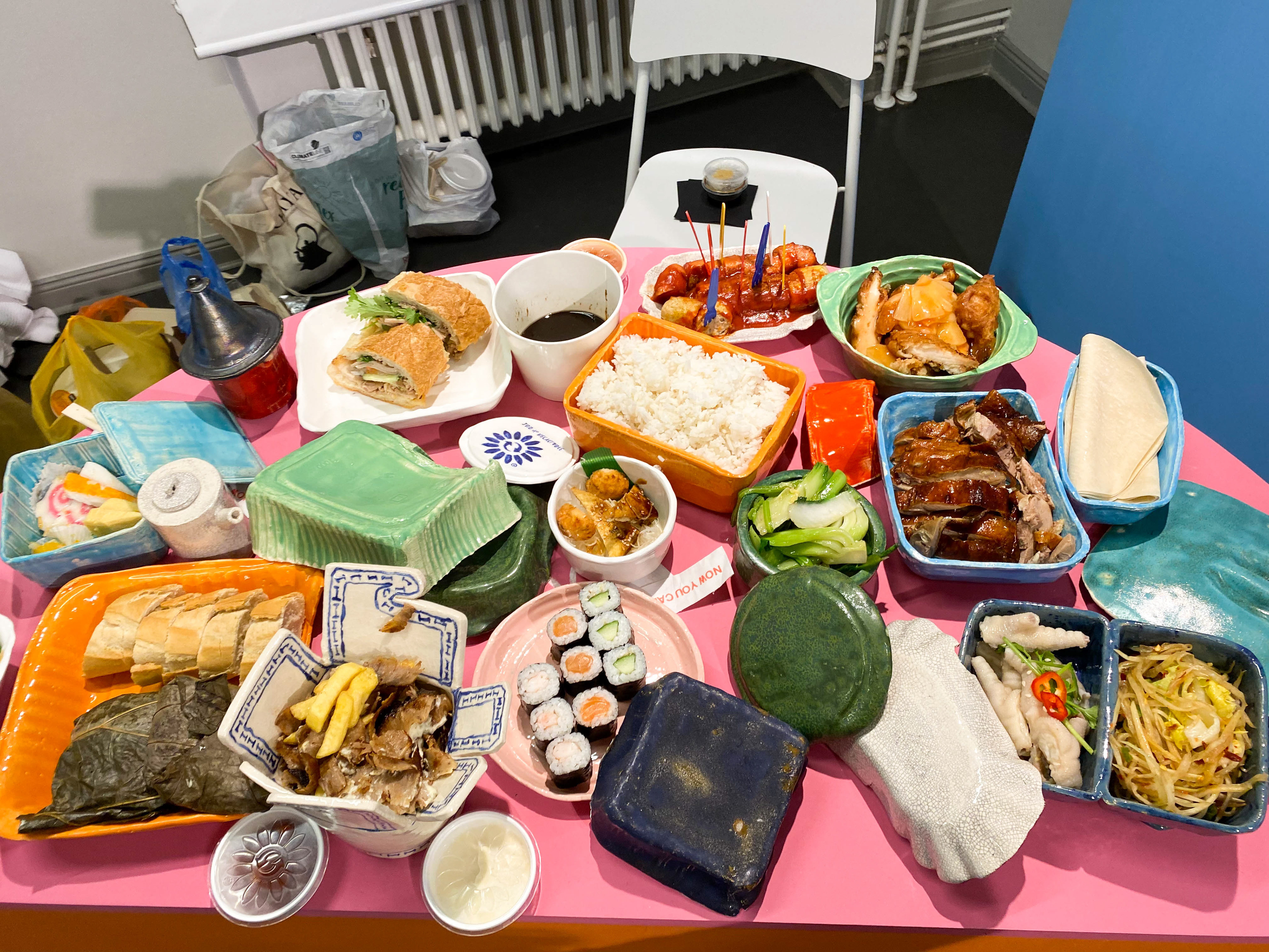 "One Street Mukbang" is based on the internet phenomenon of Mukbang, where people eat huge amounts of food and stream it live. Our installation gathers various packaging materials transferred to the medium of glazed porcelain and ceramics. On the finissage of the exhibition food from the restaurants of Berlins Kantstraße, which is known for it's culinary variety (especially asian food) could be tasted, breaking up the Covid-19 related practice of eating alone from plastic containers, encouraging discussions about what is authentic/enjoyable/local/sustainable food. The piece was made on the occasion of the exhibition "Die Kant_Text_Kunst_Straße" curated by Ina Weber and Annett Röscher. Thank you so much for making this piece possible.